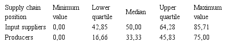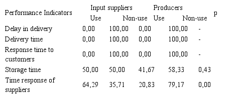 It can be observed that the differences found are statistically significant, indicating that input suppliers have higher overall use percentage of non-financial performance indicators than producers. These results suggest that individual companies may possess different performance indicators use patterns according to their respective position in the supply chain structure. Therefore, supply chain performance measurement should not consider only common metrics for all participants but also consider managerial specificities derived from core processes from all stages of the supply chain structure.