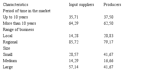In this study, ninety individual input suppliers and producers from the Recife region were randomly selected based on accessibility. Input suppliers are responsible for the supply service of all kinds of inputs – not only relating to seeds, fertilizers, pesticides, vaccines, farm implements, tools and machinery –, but also to technology improvements and information systems. Producers, whether from agriculture or livestock farming activities, represent one of the most striking characteristics of Brazilian agribusiness, especially the complexity of its production arrangements, as well as the extensive diversity of economic activities explored. All of the companies were contacted in order to verify their willingness to get involved in the study. Thirty-eight individual agribusiness companies (fourteen input suppliers and twenty-four producers) accepted the invitation. The characteristics of these groups of individual companies are presented in Table 1