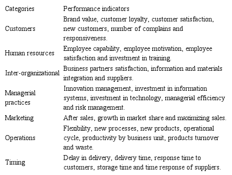 The literature provides hundreds of performance indicators that could be considered (Elrod et al., 2013). In this such case, variables selection can be performed by researcher’s choice (Gil, 2002). In addition, Raupp and Beuren (2006) state that exploratory research allows the implementation of new dimensions. To address this issue, thirty-three non-financial performance indicators were chosen from previous studies (Beamon, 1998; Gunasekaran et al., 2001, 2004; Rafele, 2004; Conceição and Quintão, 2004; Callado et al., 2008) and classified into seven categories presented in Figure 1.