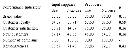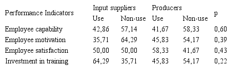 None of the performance indicators in Table 4 obtained significant results from Fisher’s Exact Test indicating that input suppliers and producers share similar managerial concerns regarding this category. It can be observed that business partners’ satisfaction received the highest amount of attention from both groups of individual agribusiness companies.