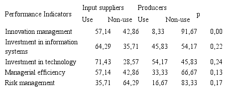 It can be observed that one statistically significant difference relating to non-financial performance indicators use patterns was found. According to the results, input suppliers have been focusing on innovation management much more than producers and null hypothesis was rejected at 99% significance level. This result indicates that the economic activities performed by them have been reflected on managerial concerns addressed to improvement on their products and/or services (such as fertilizers, pesticides, vaccines, farm implements, tools and machinery, technology and information systems) through innovation.