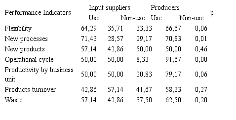 Results indicate that use patterns relating to four non-financial performance indicators from this category presented statistically significant differences. They also indicate that input suppliers have been using them more often than producers. Null hypothesis relating to use patterns differences regarding new processes and operational cycle performance measurement was rejected at 99% significance level. Null hypothesis relating to flexibility and productivity by business unit performance measurement was rejected at 90% significance level. These results suggest that use patterns of non-financial indicators relating to operations differ significantly from input suppliers to producers, indicating that the use of performance indicators has been strongly related to core activities performed.