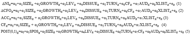 Barth et al. (2008) incluem a variável XLIST, que está relacionada à maneira como as empresas buscam capital. A variável TURN foi utilizada porque o comportamento dos accruals pode variar em função da intensidade de capital, o que também pode afetar a necessidade de capital. Para controlar esse fator, utiliza-se um controle para a variação (turnover) dos ativos, medido pelas vendas sobre os ativos totais. A variável CF foi utilizada porque características contábeis podem ser afetadas pelos fluxos de caixa. Assim, a variável CF pode controlar esse fator (Lang et al., 2006). Isso significa que o volume do fluxo de caixa pode fazer com que a empresa gerencie os resultados.