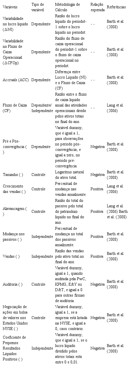 No Quadro 1, são apresentadas as variáveis de pesquisa por meio de suas definições operacionais e os efeitos esperados sobre as variáveis dependentes representadas pelas variáveis ∆NI, ∆CFOp, ACC, CF e POST.