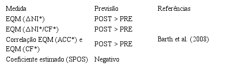 Desse modo, espera-se comparar os níveis de gerenciamento de resultado do presente estudo com as predições resultantes do trabalho de Barth et al. (2008), conforme o Quadro 2.