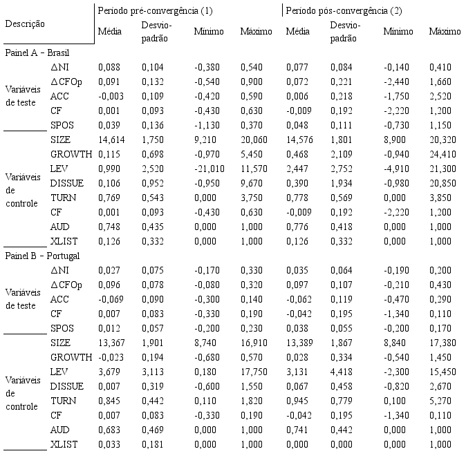 A Tabela 1 descreve a estatística descritiva das variáveis de teste e de controle das empresas brasileiras e portuguesas. Ressalta-se que, para as empresas brasileiras, foram observados os dados referentes ao período pré-convergência (2005 e 2007) e pós-convergência (2009 e 2011), reunindo um total de 572 observações. Por outro lado, para as empresas portuguesas, foram reunidas 120 observações, divididas entre os períodos de pré-convergência (2002 e 2004) e pós-convergência (2006 e 2008).