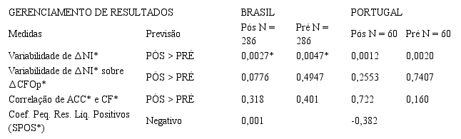 A Tabela 2 apresenta os resultados obtidos nas quatro métricas utilizadas para mensurar os níveis de gerenciamento de resultado nas empresas brasileiras e portuguesas no período pré e pós-convergência às normas internacionais de contabilidade emitidas pelo IASB.