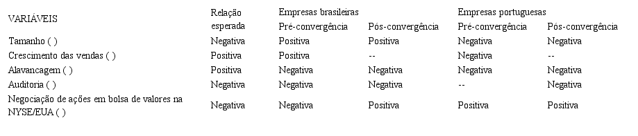 Seguem, dessa maneira, os resultados obtidos na análise de correlação entre essas variáveis para empresas brasileiras e portuguesas no período pré e pós-convergência, descriminados na Tabela 3.