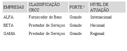 A Empresa Alfa é uma empresa de grande porte e tem um nível de atuação internacional. A Empresa Beta, também de grande porte, possui abrangência de atuação nacional. A Empresa Gama é uma empresa de grande porte, com fornecimento regional. As informações são apresentadas na Figura 2.