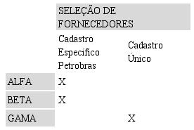 Para a escolha dos fornecedores que compõem os contratos da Petrobras, a Empresa Alfa e a Empresa Beta possuem cadastros diferenciados entre os fornecedores. Na Empresa Alfa, o “fornecedor Petrobras” é avaliado a partir de um questionário específico e cadastrado em uma categoria diferenciada no sistema da empresa. Na Empresa Beta, existe uma lista específica dos fornecedores aptos a atuarem em um contrato Petrobras, como pode ser visto na Figura 3.