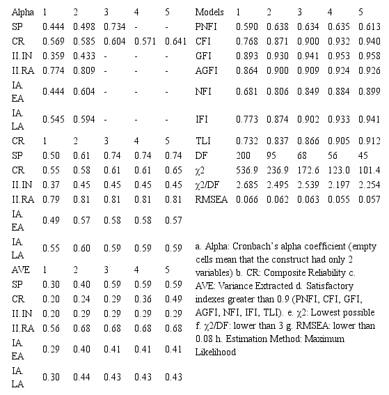 The process of modeling in this study can be considered as being accurate for several reasons. To improve the indexes of the constructs in each purification step, the following criteria were applied: First, when the P value was insignificant, the variable was removed from the model. Second, if the P value was significant, but the coefficient of β was less than 0.7 within the construct, the variable was also removed. Third, the variables removed from the model were compared with their respective factor loadings per construct, effectively resulting in the removal of the lowest factor loadings. Not all constructs indicated desirable rates for Cronbach’s alpha, for composite reliability and for variance extracted, but, for the accuracy of the processing, these indexes are acceptable. All these procedures were necessary because, despite having an adequated sample, the number of variables per construct was low, given the difficulties in the field research.