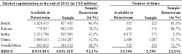 The sample is composed by firms listed in the five main emerging markets in terms of size and local geographical influence (Brazil, China, India, Russia and South Africa – BRICS). Data were collected from Datastream database from 1995 to 2013 and the sample includes a total of 2,290 listed firms in all the BRICS stock markets. Specifically, data were collected from 2,22 firms listed in Brazil, 174 in Russia, 373 in India, 1,287 in China, and 234 in South Africa.