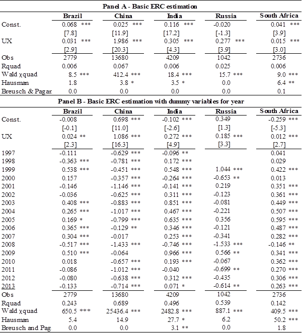 The empirical estimation of Eq. 1, with and without annual dummy variables, was conducted under pooled ordinary least squares (OLS) methodology. The choice of econometric estimation is based on both an economic reason and the nature of the data characteristics. First, this paper mainly compares the ERC among the five BRICS countries and the main focus is on country characteristics, not at a firm level, necessarily. Thus, it is not unacceptable to assume unique coefficients for all firms in a given country, since the estimated coefficients should proxy for a country-level ERC. Second, recent evidence in Freeman et al. (2011) shows that pooled regressions outperform firm-specific regressions in estimating the ERC. Finally, the pooled assumptions are confirmed by considering the nature or the data, that is, poolability tests do not reject the null hypothesis that specific variance components are equal to zero ( ), suggesting statistical homogeneity of the variable of interest between individuals for the majority of the countries. In this regard, Table 2 shows diagnostic Hausman’s and Breusch-Pagan’s tests for potential correlations between the error components and regressors and for homogeneity of variance components, respectively. All the estimations considered White’s robust estimation with diagonal heteroskedasticity corrections.