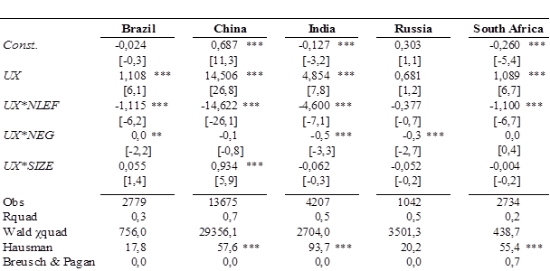 The results are presented in Table 4 and, in general, they support the individual evidence with a few differences: first, when the variables are simultaneously analysed the negative effect of NLEF loses its significance in Russia, suggesting that, for this country, the negative effect is more relevant and offsets the other effects in ERC. Second, and more importantly, the positive and significant coefficients in NEG, documented in China and South Africa lose their significance when jointly analysed with other variables. This evidence sheds some light in the intriguing findings displayed in Table 3, since it suggests that the positive effect of unexpected losses on ERC is offset by NLEF, which can indicate a significant association between NLEF and NEG in the sense that more extreme magnitudes of unexpected earnings are associated with losses (correspondence analysis confirm this idea). Finally, the firm size effect in Brazil loses its significance, suggesting that, when jointly estimated, the two first effects (NLED and NEG) are more relevant to explain differences in ERC than size.