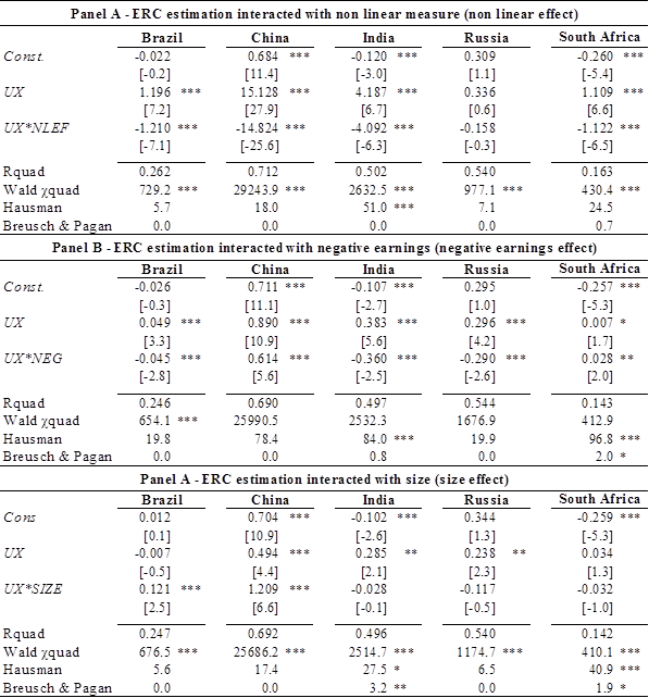 Additionally, this paper documents that controlling ERC estimation for time (annual) variation is important and that the nonlinear effect of unexpected earnings in ERC is a common trend in all evaluated countries (i.e. a negative and significant relationship between ERC and nonlinear effects was documented) with the exception of Russia. The negative earnings effect in ERC is documented in Brazil, India and Russia (i.e. a negative and significant relationship between ERC and unexpected losses was documented) while it does not hold true for China and South Africa. Only in China a significant effect of firm size in the way market agents incorporate earnings information in the long run is observed (i.e. only China showed a significant and positive effect of firm size on ERC).