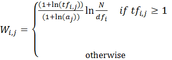 Chisholm and Kolda (1999) emphasized that application of the vector space method requires the use of a term weighting schema capable of determining the weight of the term in a corpus. We adopted the same scheme used by Loughran and McDonald (2011), since the results presented by these authors showed that the model mitigated noise caused by word misclassification. The model for term weighting is (Loughran and McDonald, 2011):
