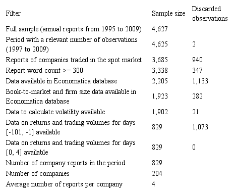 A total of 940 reports, from companies that had not been traded in the spot market in the period, were also discarded, leaving a sample of 3,685 reports. Another 347 reports were discarded because they did not comply with the minimum 300 words per report requirement, a criterion adopted aiming to eliminate reports with low relevance (Clatworthy and Jones, 2001), leaving a sample of 3,338 reports.