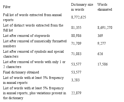 In the next step, we extracted the vocabulary with all the words used in the annual reports (Jurafsky et al., 2002; Cecchini et al., 2010; Van den Bogaerd and Aerts, 2011). We defined a number of criteria before starting to build the vocabulary. First, we wanted to take into account only one occurrence of each word. Second, we also needed to remove all words that match our stop-words list (Cecchini et al., 2010). These include prepositions, conjunctions, pronouns and certain verbal forms that usually do not have explanatory relevance in texts (Savoy and Gaussier, 2010). Third, we did not want to include numbers expressed in numeric format. Since symbols and special characters are not words, they were also discarded (Liu et al., 2005). Finally, we eliminated from the vocabulary all words formed by one or two characters only. The final product of this process was a vocabulary containing 53,577 distinct words, as illustrated in Table 2.