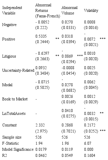 Our results indicate a very weak association between the tone of annual reports and stock market variables in Brazil. When we measured filing period returns using the Fama-French three-factor model (1993), we found a weak association between our tone measures and abnormal returns. When using CAPM, however, we found no association between the tone measures and filling period returns. We also found weak associations between the tone measures and both filing period trading volume and stock prices volatility.