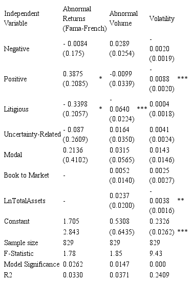 All models are significant, as reported by the F-statistics, but we observed poor measures or adjusted R squared for the models with returns and abnormal volume as dependent variables. Contrary to Loughran and McDonald’s (2011) observations, we find that our negative word lists is not associated with any dependent variable. Moreover, our positive word list is associated with significant higher returns, and the litigious word list is negatively associated with returns, which is also in contrast with Loughran and McDonald’s (2011) results. When abnormal volume is the dependent variable, only the litigious word is significant. Since the coefficient is negative, the more the litigious words that appear in the annual report, the lower is the abnormal trading volume during the event window.