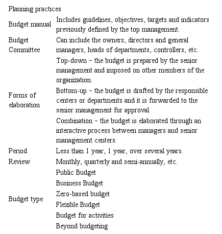 Several observed practices relate to budget planning. The operating budget includes guidelines, objectives, targets and indicators previously laid down by the organization. Joshi et al. (2003) identified that 96.3% of the 54 surveyed companies in Bahrain emit the LDO, and Uyar and Bilgin (2011) show that 63% out of 79 companies surveyed prepare budgeting manuals, a trend also found in the search conducted by Steed and Gu (2009), which checked the establishment of budgetary guidelines for senior management at an average of 4.5 points on a scale of one to five on 121 surveyed companies. Table 1 presents the main planning practices according to the literature.