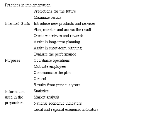 Budgeting represents the effort of the Organization to quantify the uptake and use of resources, which addresses two management purposes: planning and control (Garrison et al., 2003). It is a prediction of the future period, which includes marketing and other information that lead to the establishment of objectives and performance measurement (Harris, 1999). As part of budgeting, the forecast is needed for the planning of better ways to meet the volume of sales (Schmidgall and Defranco, 2006). Hopwood (1983) argues that planning, budgeting and performance monitoring procedures operate at different organizational levels, are subject to different degrees of participation, have different expectations and practices for their revision, and can even consider very different time periods.