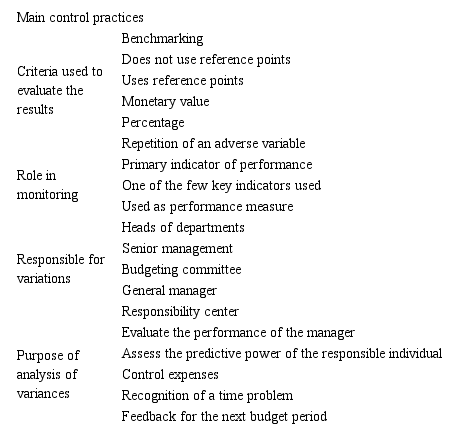 In budgeting control, an important point is the role that monitoring has on the management system of the Organization. For Uyar and Bilgin (2011), most companies surveyed stated that the budget is the primary indicator of performance (47%), followed by one of the few key performance indicators (37.5%), and low budgets are used as performance measure (10%). In Table 3, it is possible to check the main control practices.