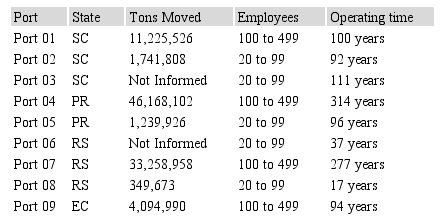 The research population is constituted by the 34 Brazilian public ports. The sample of the survey was constituted by 9 public ports that participated in the survey –3 ports located in Santa Catarina, 2 in Paraná, 3 in Rio Grande de Sul and 1 in Ceará.