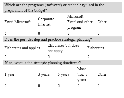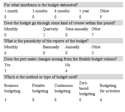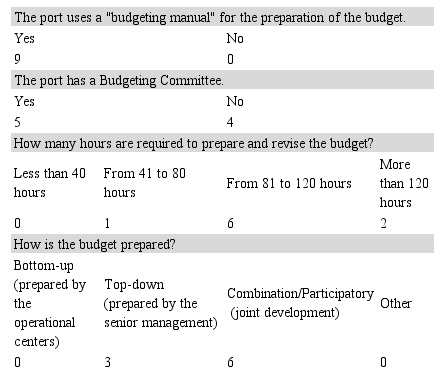 Although all the ports have a specific department, 4 ports do not have a Budgeting Committee. This Committee is important because it streamlines the budgeting process, with the participation of people from different levels of the organization. In addition to the establishment of the measures, this is a process that is agreed upon and that counts on the participation of the different levels of the Organization, and which is not a top-down imposition. The studies by Uyar and Bilgin (2011) held in Turkey show that the use of a Committee and the operating budgeting are common in Turkish companies.