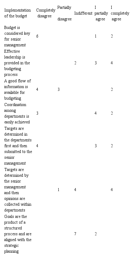 In implementing the budget process, some items are directly related to the performance. The survey conducted by Uyar and Bilgin (2011) questioned the following items: the budget is prepared in secret by the senior management (3.78), effective leadership is provided in the budgeting process (4.57), a good flow of information is available for budgeting (4.54), coordination among departments is achieved easily (4.22), goals are determined first in the departments and then submitted to the senior management (3.67), goals are determined by the senior management and then opinions are collected within the departments (3.35), targets are determined rationally (4.29). Table 2 presents the main practices singled out in execution.