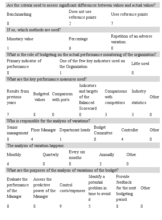 To improve the analysis and to better understand the differences in the results in relation to national and international studies, a semi-structured interview was held with those responsible for coordinating the budgeting process of the ports. The results demonstrate that the ports employ partial practices, however, some can be highlighted.
