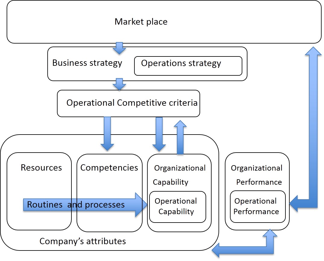 Based on the literature review, a theoretical framework is proposed. This framework follows the perspective that the company defines its goals (performance objectives), means (resources, competences and capabilities) and paths (strategy) to guarantee the expected performance (Peng et al., 2008). The same applies to the operational level (Flynn et al., 2010), which is aligned to fulfill its role within the corporate strategy (Wheelwright, 1984; Peng et al., 2008).