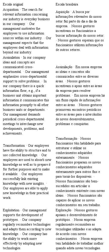 A validade nomológica foi garantida pelo emprego de construtos previamente testados em outros contextos como em Flatten et al. (2011), pois, se foram capazes de medir o que se propõe em outros estudos, devem ser capazes de medir na presente pesquisa (Peter, 1981). Para a validação do instrumento também foi utilizado o método da validação de conteúdo, que envolve a avaliação e o julgamento de experts sobre o conteúdo, a escala de medida e a avaliação de sua representatividade na mensuração. O instrumento foi previamente avaliado por seis especialistas, doutores em administração e pesquisadores sobre conhecimento organizacional, que sugeriram alterações da redação de algumas variáveis e atestaram a adequação do instrumento. As escalas original e adaptada encontram-se no Quadro 1.
