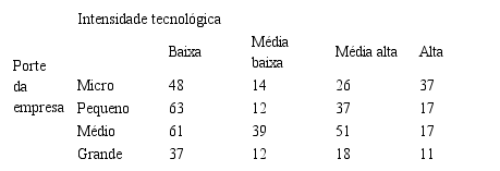 A classificação da OCDE de intensidade tecnológica dos setores industriais, devido à credibilidade internacional da organização, tem sido adotada por parte de alguns autores, mesmo em países com baixos padrões tecnológicos. Entretanto, esta classificação tem sido criticada por outros. Para Furtado e Carvalho (2005), por exemplo, a classificação da OCDE reflete o comportamento da indústria dos países desenvolvidos em escala mundial, sendo pouco significativa para países em desenvolvimento, como o Brasil. Sendo assim, os setores foram classificações de acordo com o CNAE (IBGE, 2013) e a intensidade tecnológica de acordo com Furtado e Carvalho (2005). Os elementos foram selecionados para cada estrato por amostragem aleatória simples. O total de elementos da amostra em cada estrato está representado no Quadro 2.