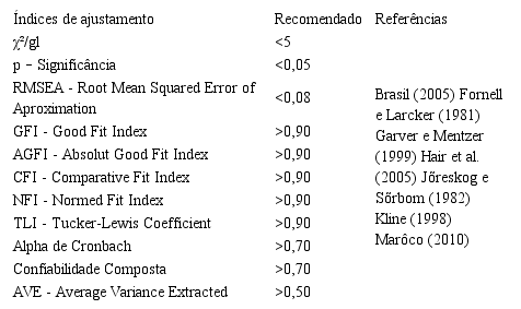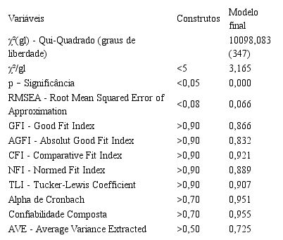 A seguir, procedeu-se à análise do ajuste geral do modelo de mensuração, conforme os índices representados no Quadro 3. Os índices que determinam o grau em que o modelo prediz a matriz de covariância observada apresentaram-se dentro dos padrões aceitos pela literatura. Tais resultados podem ser conferidos na Tabela 3.