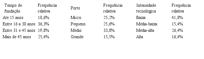 Foram considerados válidos 495 casos, representando uma ampla faixa de variações de características organizacionais, incluindo empresas de 10 a 12 mil funcionários, desde empresas recém-formadas até empresas com mais de cem anos de fundação, empresas que operam em 23 atividades industriais diferentes, com intensidades tecnológicas, investimento em P&D e grau de inovações diferentes. O grau de variabilidade obtido na coleta foi preservado e considerado como indicador da qualidade dos dados empíricos (Hair et al., 2005). A Tabela1 apresenta a descrição da amostra de empresas.