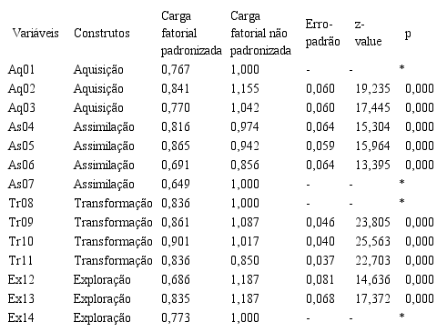 Conforme indicado, para a verificação da validade e da confiabilidade dos construtos, procedeu-se à análise da confiabilidade composta e variância média extraída e de seus fatores (Anderson e Gerbing, 1988; Hair et al., 2005). Todos os índices se mostraram adequados, já que os valores obtidos para a Confiabilidade Composta foram acima de 0,70 (Aquisição = 0,901; Assimilação = 0,903; Transformação = 0,949; Exploração = 0,882). No caso dos índices de variância média extraída, todos ficaram acima de 0,50 (Aquisição = 0,752; Assimilação = 0,703; Transformação = 0,823; Exploração = 0,714).