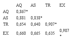 Assim, a verificação da validade convergente e discriminante foi realizada por meio do critério de Fornell e Larcker (1981), no qual o valor da raiz quadrada da variância extraída deve ser superior aos valores das correlações entre os construtos. As validades convergente e discriminante podem ser verificadas na Tabela 4.