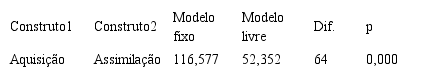 Como é possível observar, os construtos Assimilação e Aquisição aparentaram convergir. Os valores dos demais construtos indicam validade convergente e discriminante para as medidas do modelo. Como a variância extraída média demonstrou que os construtos Assimilação e Aquisição poderiam ser convergentes, optou-se por testá-los com base no critério de Bagozzi e Phillips (1982)[3]. Basicamente os construtos são testados em pares, comparando-se o modelo fixo e o modelo livre, analisando sua significância. Pode-se verificar no teste que os dois construtos são significativamente diferentes.