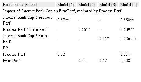 The analysis demonstrated that there is full mediation by construct "Performance at the Processes-level". According to Baron and Kenny (1986) and Chen and Tsou (2012), mediation exists when the following conditions are confirmed, jointly: (1) the independent variable (Internet Bank Cap) significantly impacts the mediator (Process Perf); (2) the mediating variable (Process Perf) significantly impacts the dependent variable (Firm Perf); (3) the independent variable (Internet Bank Cap) significantly impacts the dependent variable (Firm Perf); (4) the impact of the independent variable (Internet Bank Cap) on the dependent (Firm Perf) is reduced or not significant when inserting the mediator (Process Perf) in the model. The results of these conditions are presented in Table 5 models.