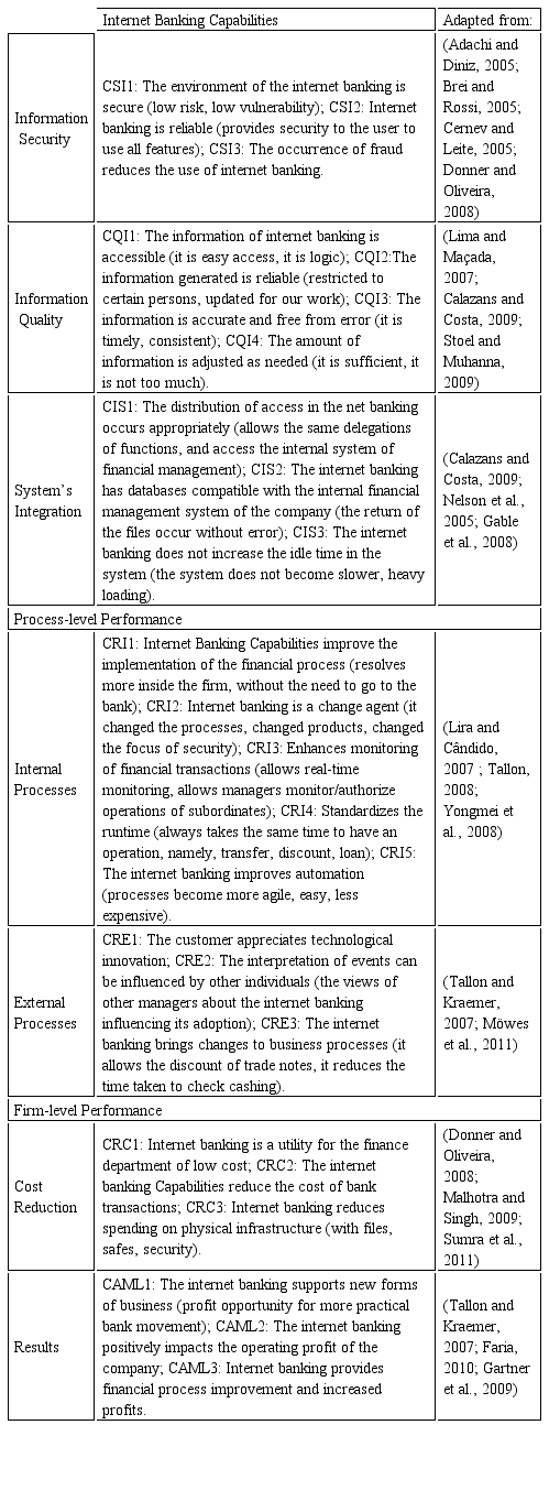 Internet Banking Capabilities are resources available to enterprises (bank customers) as an extension of financial services and contracted credit, designed to promote the speed of transactions and the agility of internal financial departments, among other impacts. Whereas such capabilities depend on the quality of specific factors (e.g., information, security, systems), the level of knowledge of users taking the application in organizations, the IT infrastructure available etc., potentially, such capabilities should be understood as singular resources to the organizational environment which adopts them (i.e., customers companies). In this case, in its way the Internet Banking Capabilities incorporate specific elements of firms, related to its history and culture, especially regarding the dynamics of use, which approaches them to the concept of IT capabilities addressed in the area of IS (Bharadwaj, 2000).