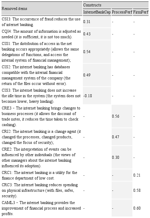 Note that all factor loadings are greater than 0.60 (Table 2) – complying with the recommendation of the literature. Therefore, the explained variance for each item exceeds the minimum 0.25 (Hair et al., 2005). In addition, we present the items and factor loadings removed from the model (Table 3), based in practical, statistical significance and model analysis as a whole.