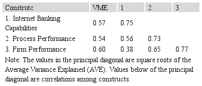 In studies with latent variables, the measurement model usually is analyzed in terms of convergent and discriminant validity (Bradley et al., 2012), before the structural modern to be tested. The convergent validity of the constructs (Table 4) was calculated considering the Average Variance Explained (AVE>0.50), as described in literature (Fornell and Larcker, 1981; Tallon, 2010).