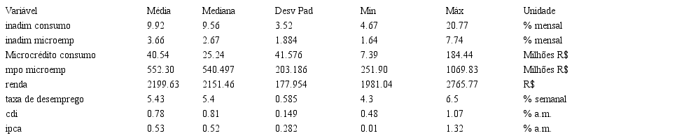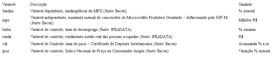 Os dados desta pesquisa foram coletados nos sites do Banco Central do Brasil e do IPEA.[3] As informações são agregadas a nível Brasil e estão em série de tempo, cujo período vai de janeiro de 2011 a abril de 2015, representando uma amostra de 49 observações. Do Banco Central, foram utilizadas as informações de crédito com recursos direcionados para pessoas físicas – microcrédito destinado ao consumo e aos microempreendedores para mensurar o MPO (variável independente). Também foram coletados os dados relativos à variável inadimplência (variável dependente), CDI e índice de inflação pelo site do Banco Central e as taxas de desemprego e renda pelo site do IPEADATA. As descrições das variáveis e suas respectivas unidades estão apresentadas na Tabela 1.