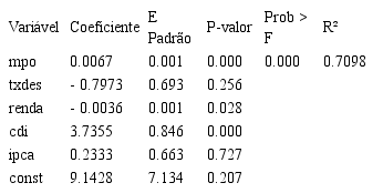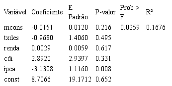 A equação de regressão proposta nesta pesquisa para estimar a variação da inadimplência do MPO correlacionada com o montante de concessão do MPO contém quatro variáveis de controle, sendo três relativas a indicadores econômicos – taxa de desemprego, rendimento médio real e IPCA – e um indicador de taxa de juros, o CDI.