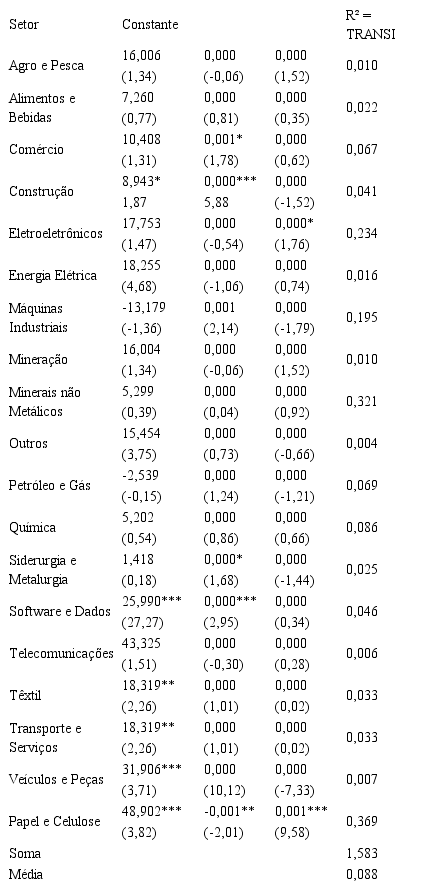 Constatou-se uma consistente variabilidade entre os TRANSI (R²) dos setores, além de falta de constância entre os coeficientes dos lucros () e das diferenças dos lucros (