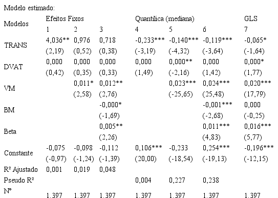 Para testar se TRANS é relacionada negativamente com o Custo de Capital Próprio Esperado (CCEi,t), estimou-se a regressão expressa na Equação 5. Para isso, utilizou-se o teste de Hausman (1978) para identificar a utilização de Efeitos Fixos para a estimativa de regressões com dados em painel. Adicionalmente, ao observar a existência de altos desvios-padrão das variáveis e a possibilidade de heterocedasticidade, foram estimadas regressões quantílicas na mediana, para controlar os efeitos de outliers, e pelo método Generalized Least Squares (GLS), que fornece estimativas não viesadas na presença de heterocedasticidade.