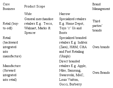 In view of the previous discussion, we propose a classification of international retailers with respect to three dimensions: (a) product scope – wide or narrow; (b) brands’ management – own or third parties’; and (c) company’s core business – retailing or manufacturing (see Table 1).