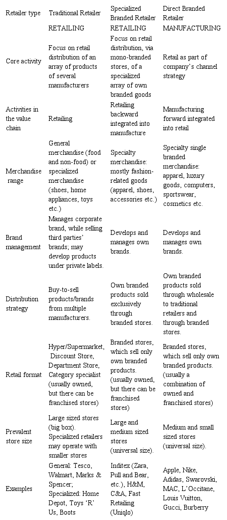 For the purposes of this paper and in order to avoid possible misinterpretation stemming from the multiplicity of terms used in the literature to refer to the retailers types, multi-branded retailers, either general or specialized, will be jointly named as Traditional Retailers. In seeking for parsimony, we opted to join both types into one because they differ only in one less relevant dimension (product scope). The distributors of the brands they develop and manage through backward integration into manufacturing (represented by some of the most prominent fashion retailers) will be named as Specialized Branded Retailers. And the manufacturers’ direct retail business (e.g., in the fashion, luxury goods, sportswear, computers industries, among others) will be named Direct Branded Retailers.