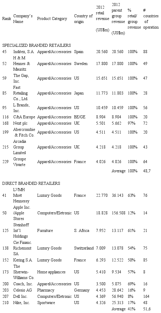 We searched in the 250 top retailers of Deloitte’s report (Delloite, 2014), and found 148 international retailers; out of those, 128 were classified as Traditional Retailers (either General Merchandise or Specialized Retailers), 10 were classified as Specialized Branded Retailers and another 10 as Direct Branded Retailers – the latter two categories being the focus of this study and listed in Table 3.